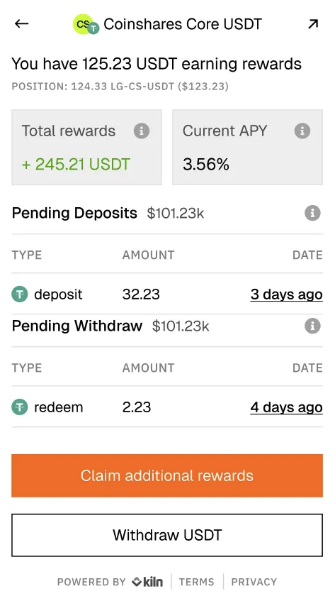 As a User, I see my positions and rewards, so that I can assess my performance._ 1️⃣ You can completely abstract away the fact that there is a yield bearing token that represent the user position and show the user position in the underlying asset. In this case we decide to display the |